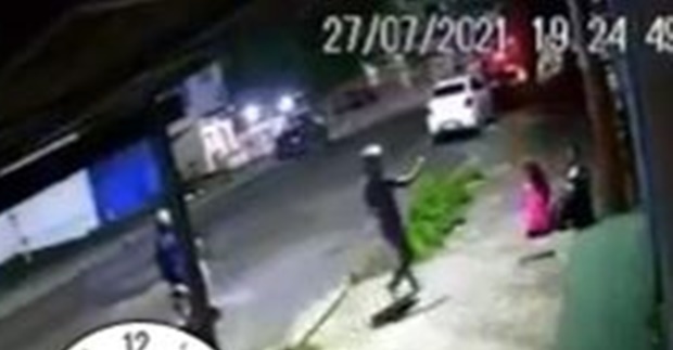 No momento da ação, o criminoso chega junto com um comparsa em uma motocicleta de placa não identificada e vai em direção das vítimas. Ele aponta a arma para a criança e obrigada a mãe entregar os seus pertences. Em seguida, ele sobe na motocicleta e vai embora.