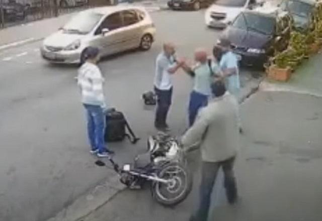 A vítima do assalto, de 27 anos, é vista caminhando na rua quando o ladrão, em uma moto, surpreende a mulher e tenta roubar a bolsa dela. Na sequência, dois homens saem de uma loja e partem para cima do assaltante, derrubando-o no chão.