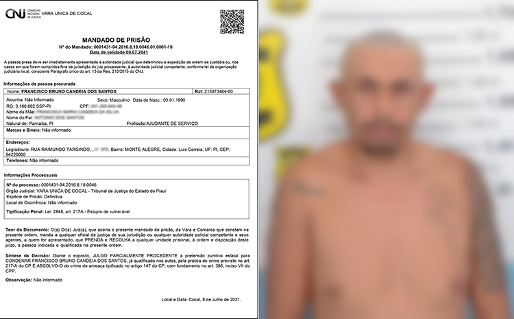 Uma ação conjunta entre a Polícia Civil e a Polícia Federal resultou na prisão do ajudante de pedreiro, Francisco Bruno Candeia dos Santos, de 32 anos, sentenciado pela Comarca de Cocal pelo crime de estupro de vulnerável no bairro Monte Alegre em Luís Correia, litoral do Piauí.