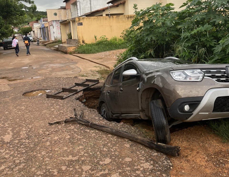 Uma cratera se abriu após o asfalto ceder na Rua Joaquim Viana, no bairro Passagem das Pedras, em Picos, e um veículo modelo Renault Duster foi engolido pelo buraco. As informações são do Cidades na Net.