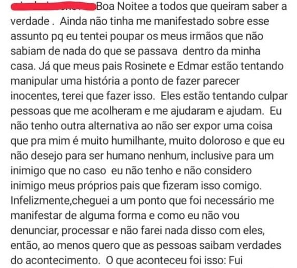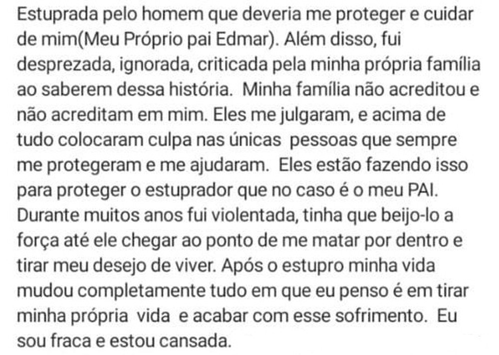 Na publicação, a vítima disse que era ela era forçada a beijar o pai. Ela diz ainda que, ao contar o caso, foi ignorada e desprezada pela própria família, que estaria culpando as pessoas erradas.