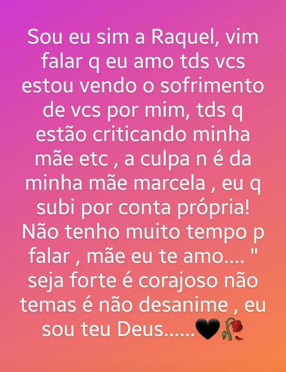 "Oi, eu sou uma anjinha, não posso responder por mim, então é minha mãe que está falando com todos vocês. Sou eu, sim, a Raquel. Vim dizer que amo todos vocês e estou vendo o sofrimento de vocês por mim. Todos que estão criticando a minha mãe, Marcela, a culpa não é dela. Eu que subi por conta própria! Não tenho muito tempo para falar. Mãe, eu te amo. Seja forte e corajosa. Não temas e não desanimes, eu sou teu Deus", colocou Marcela, em texto publicado.