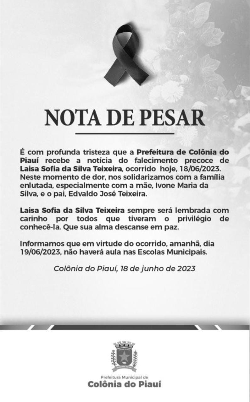 A Prefeitura de Colônia do Piauí divulgou nota de pesar pela perda precoce da garota.
