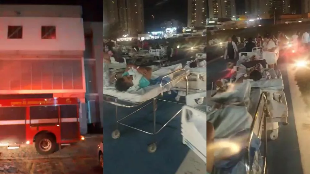 Imagens que circularam nas redes sociais mostram o momento em que pacientes são retirados do prédio e realocados em cadeiras de rodas e macas no estacionamento da unidade hospitalar.